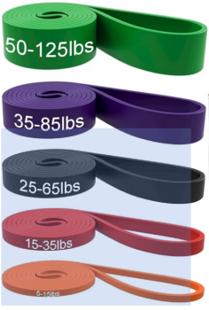 Package Included: 5 pull up bands, 1 carrying bag and 1 workout guide. Resistance bands are 5-15 lbs,15-35 lbs, 25-65 lbs, 35-85 lbs, 50-125 lbs. Use these exercise bands to perform rows, pulls, raises, and fly workout sets to exercise your arms, back, hips, legs, chest, and abdominal region